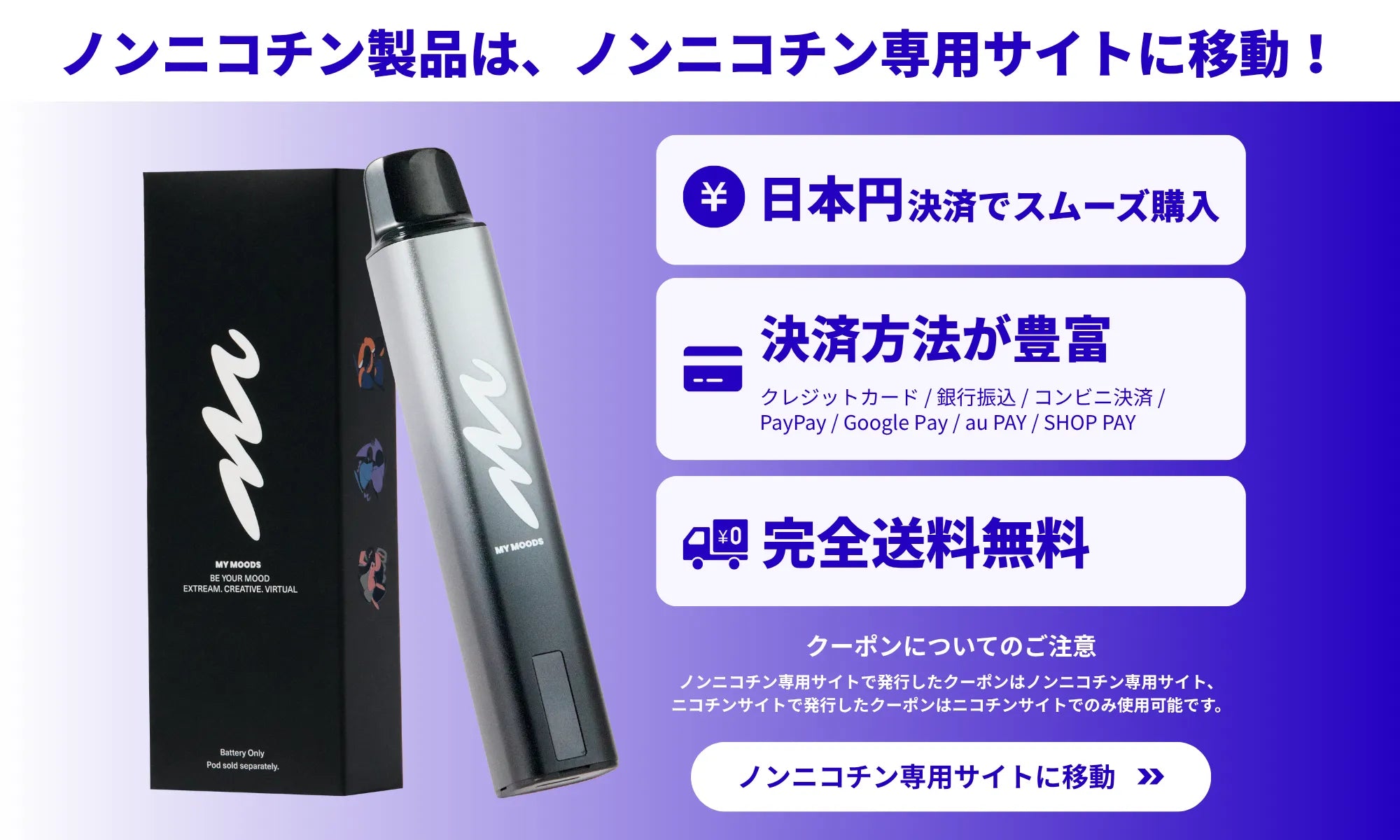 My Moods VAPEには、人体に著しく有害な成分であるタールは含まれておりません。ニコチン入りの製品に関してはニコチンが含まれています。