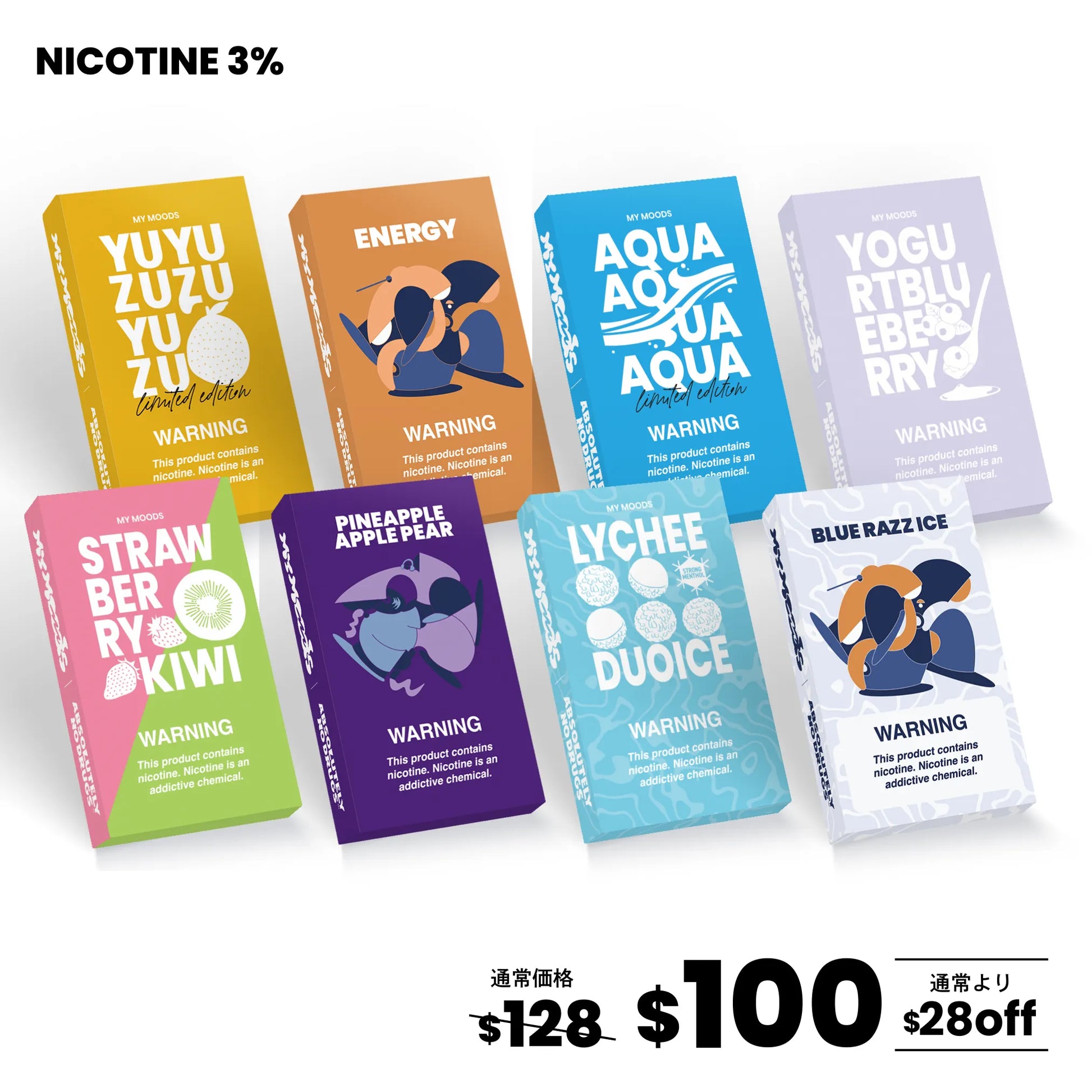 MyMoodsが「Moodを変えるVAPE」をコンセプトに大手香料メーカーと約2年の期間を掛けて開発したニコチン3%POD型VAPEのニコチン入りPODが約$128分が入ったお得なセットとなります。