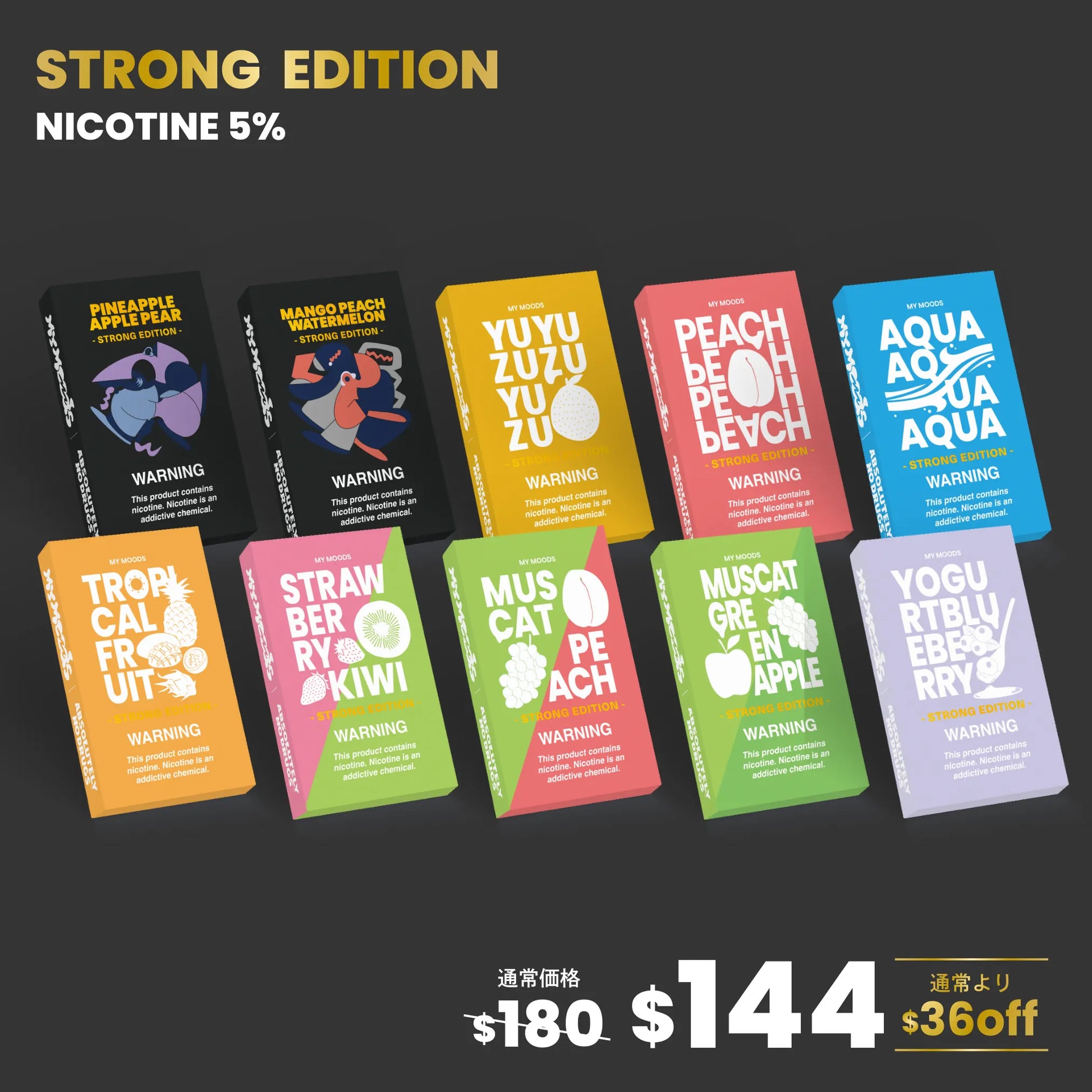 MyMoodsが「Moodを変えるVAPE」をコンセプトに大手香料メーカーと約2年の期間を掛けて開発したニコチン5%POD型VAPEのニコチン入りPODが約$180分が入ったお得なセットとなります。