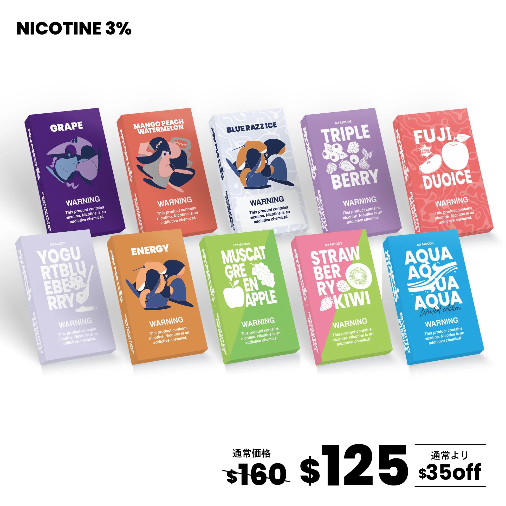 MyMoodsが「Moodを変えるVAPE」をコンセプトに大手香料メーカーと約2年の期間を掛けて開発したニコチン3%POD型VAPEのニコチン入りPODが約$160分が入ったお得なセットとなります。