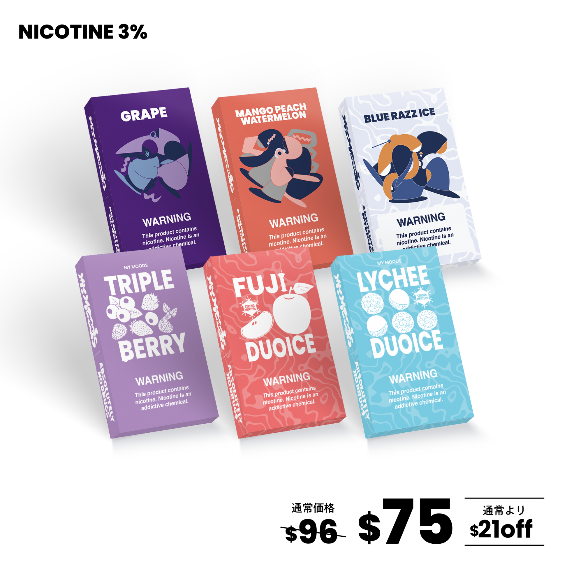MyMoodsが「Moodを変えるVAPE」をコンセプトに大手香料メーカーと約2年の期間を掛けて開発したニコチン3%POD型VAPEのニコチン入りPODが約$96分が入ったお得なセットとなります。