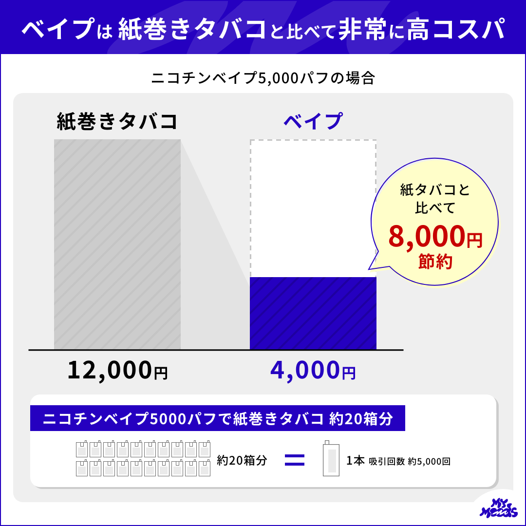 MyMoods VAPEは5,000パフ(2,500×2)吸入可能で、これは紙巻タバコ20箱(12,000円)、アイコス18箱分(10,440円)に相当します。