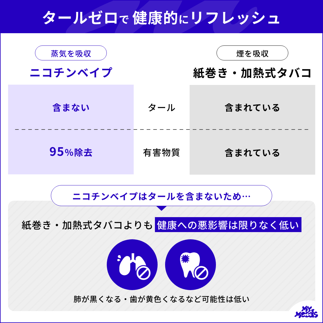 タールは紙タバコに含まれる発がん性を持った物質です。肺が黒くなる・歯が黄色くなるなど、健康に様々なデメリットがあることが確認されています。ニコチンベイプはこの有害なタールをいっさい含んでいないため、快適に吸い続けることが可能です。