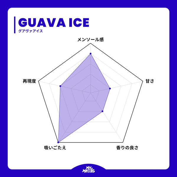 トロピカルなグアバの濃厚な甘みとみずみずしさに、スッと抜けるような清涼感を加えた南国系フレーバー。まろやかな果実感の中に、クールなICEの刺激が心地よく重なり、気分を切り替えたいときやリフレッシュしたい瞬間にぴったり。南国の風を感じる味わいです。