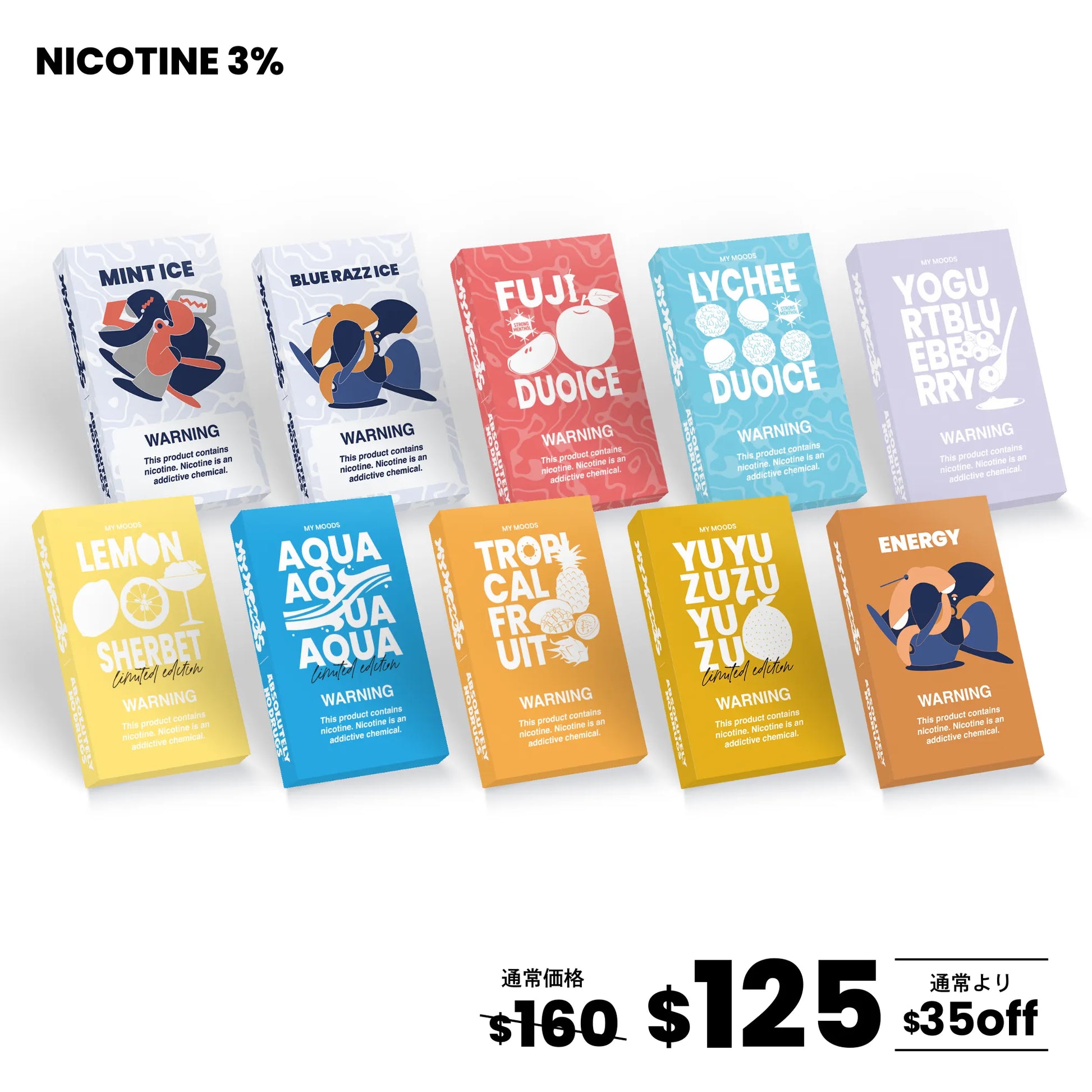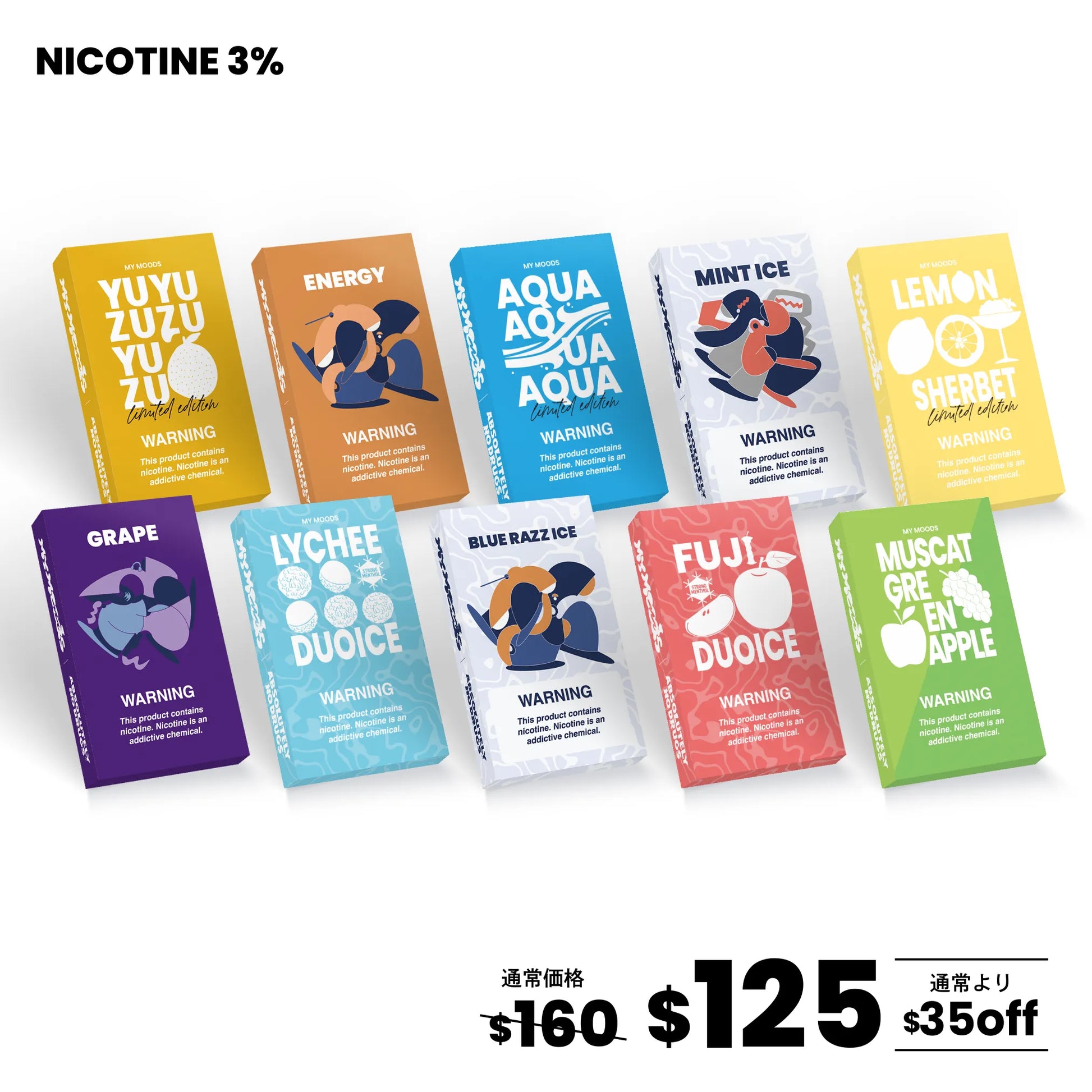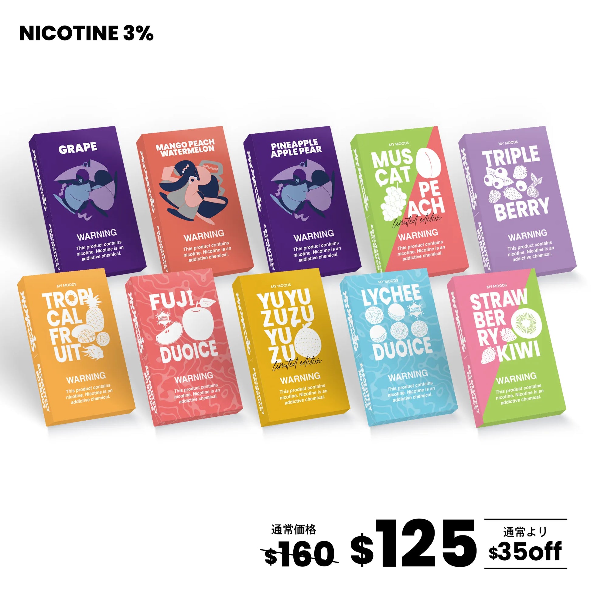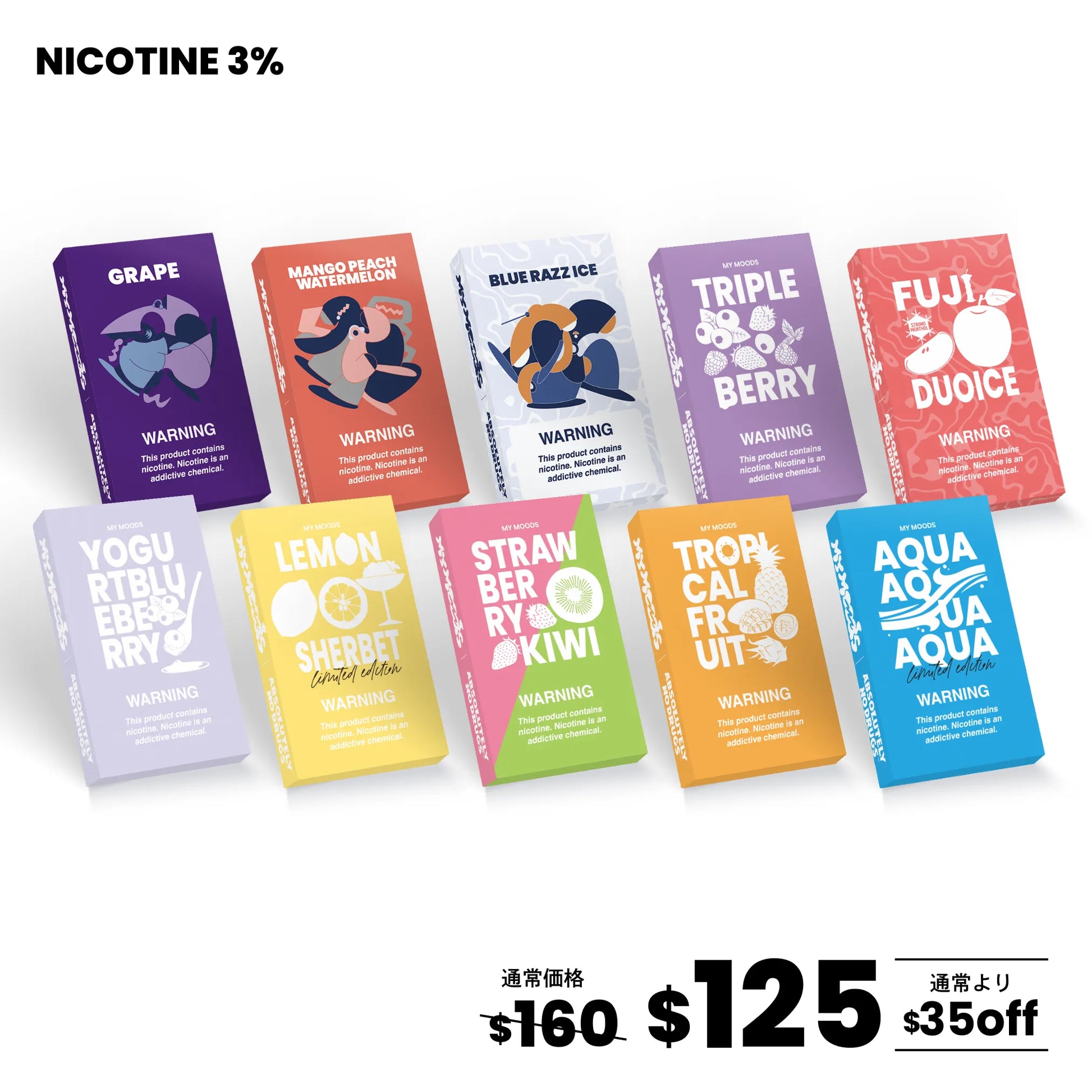 MyMoodsが「Moodを変えるVAPE」をコンセプトに大手香料メーカーと約2年の期間を掛けて開発したニコチン3%POD型VAPEのニコチン入りPODが約$160分が入ったお得なセットとなります。