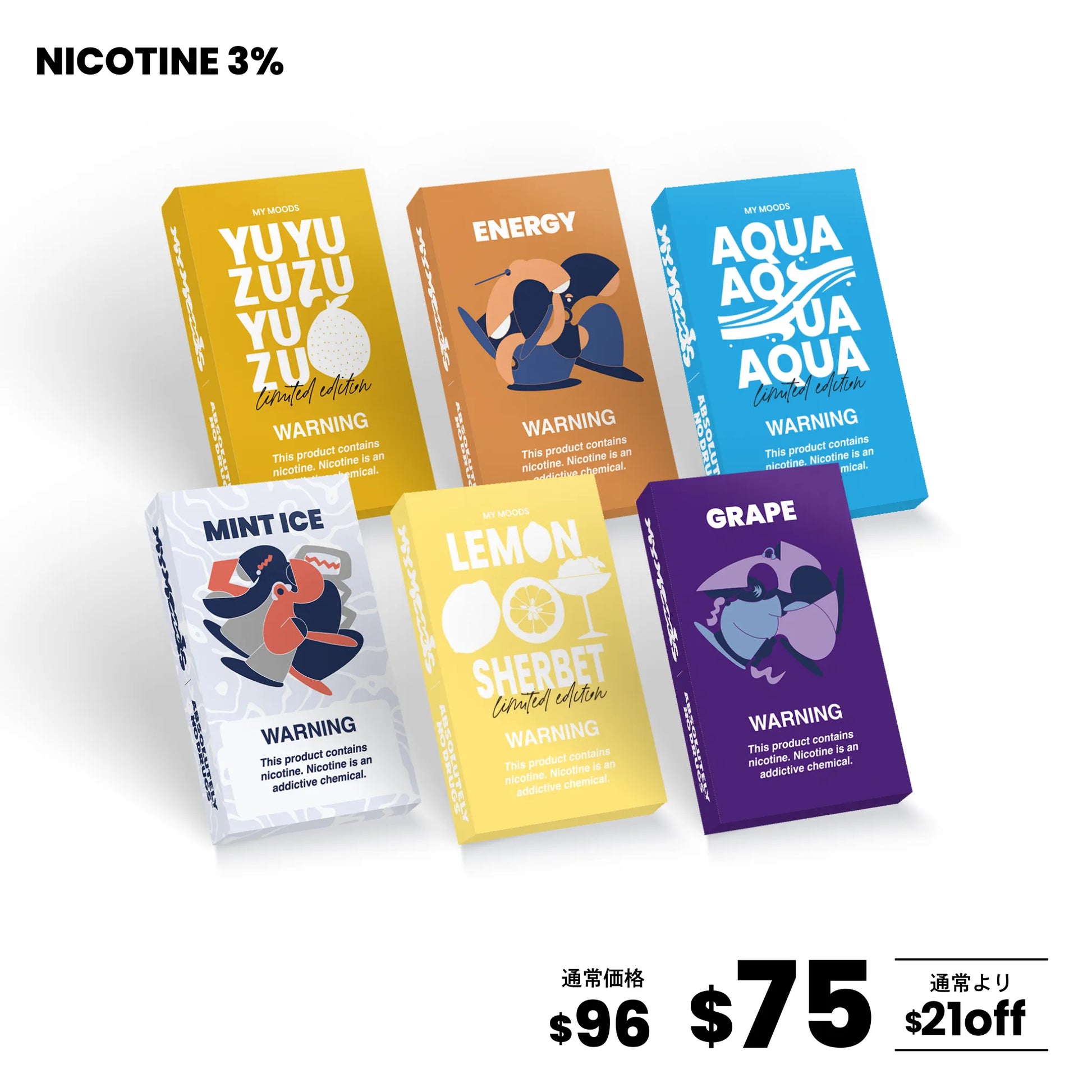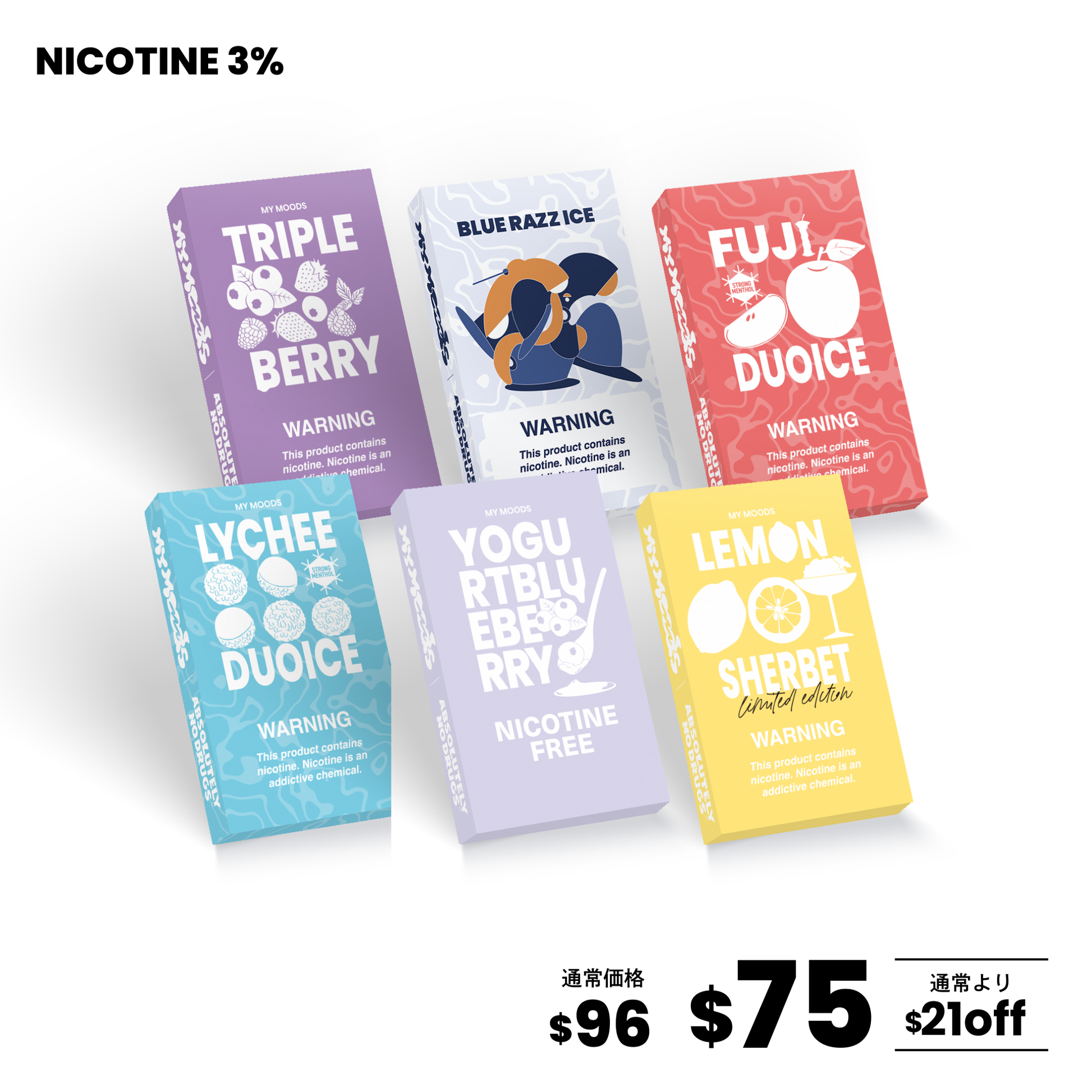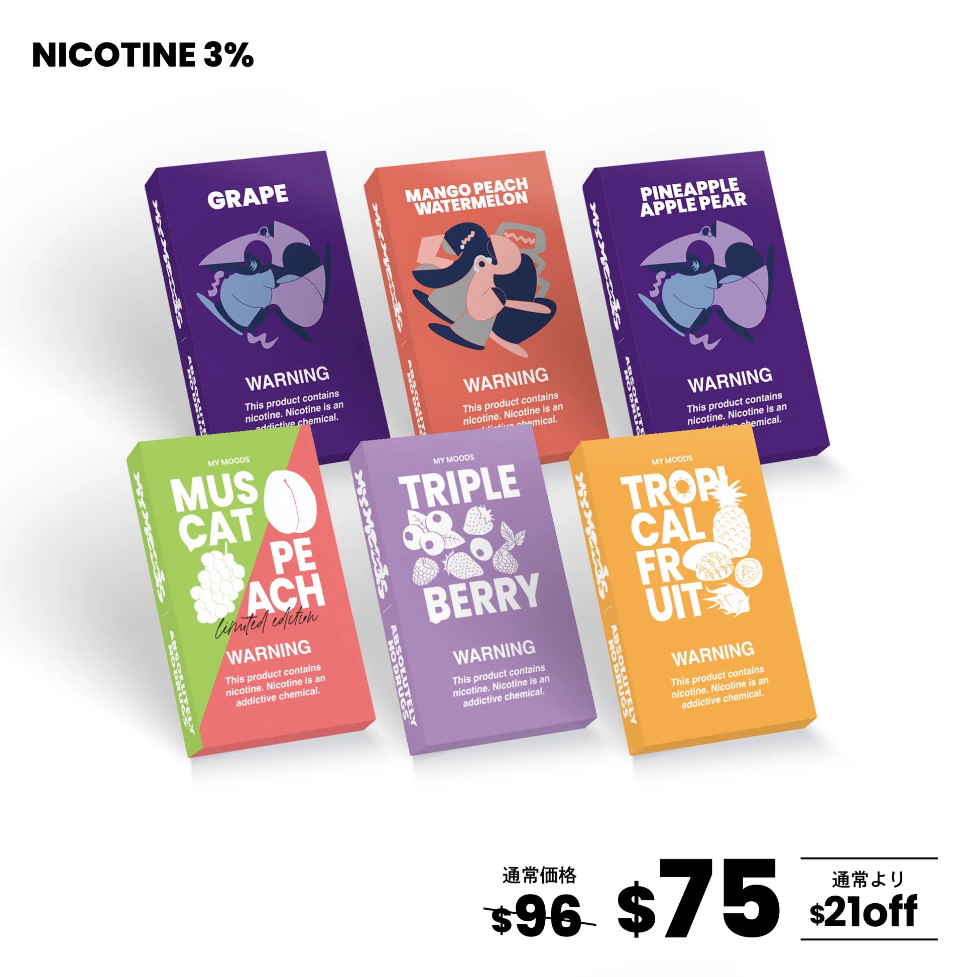 MyMoodsが「Moodを変えるVAPE」をコンセプトに大手香料メーカーと約2年の期間を掛けて開発したニコチン3%POD型VAPEのニコチン入りPODが約$96分が入ったお得なセットとなります。