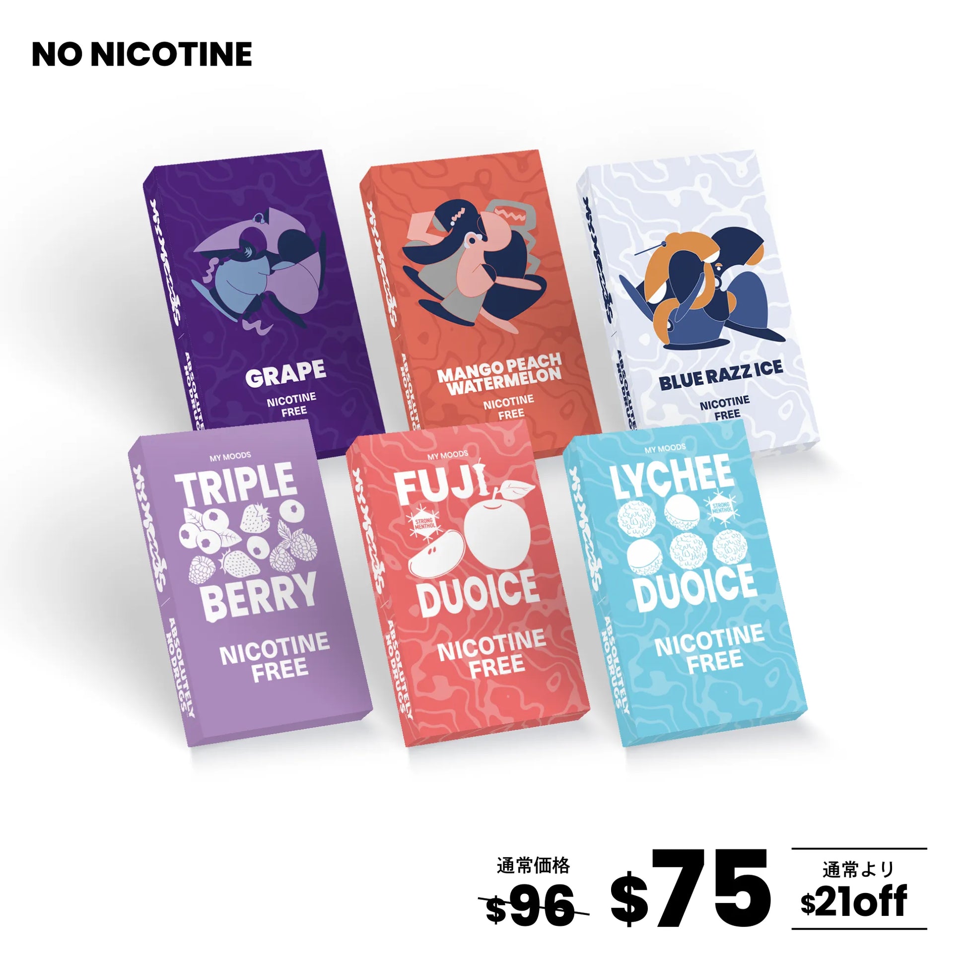 MyMoodsが「Moodを変えるVAPE」をコンセプトに大手香料メーカーと約2年の期間を掛けて開発したノンニコチンPOD型VAPEのノンニコチンPODが約$96分が入ったお得なセットとなります。