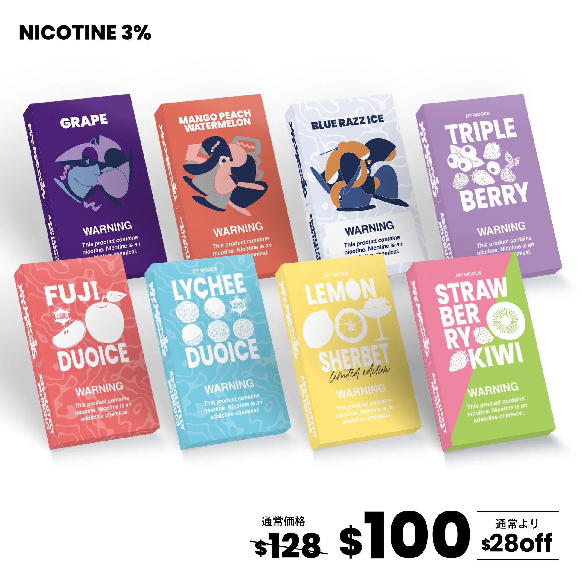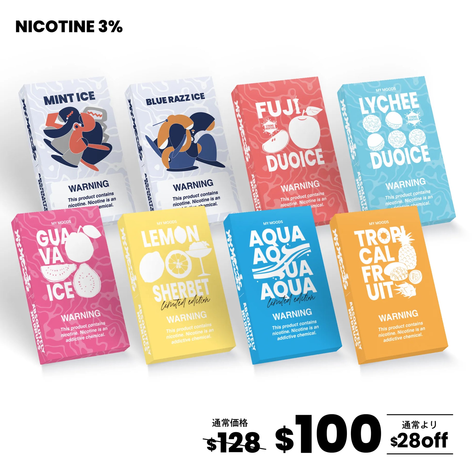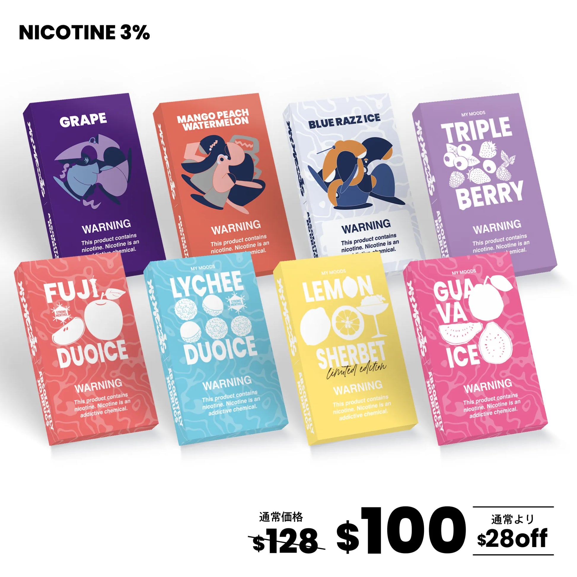 MyMoodsが「Moodを変えるVAPE」をコンセプトに大手香料メーカーと約2年の期間を掛けて開発したニコチン3%POD型VAPEのニコチン入りPODが約$128分が入ったお得なセットとなります。