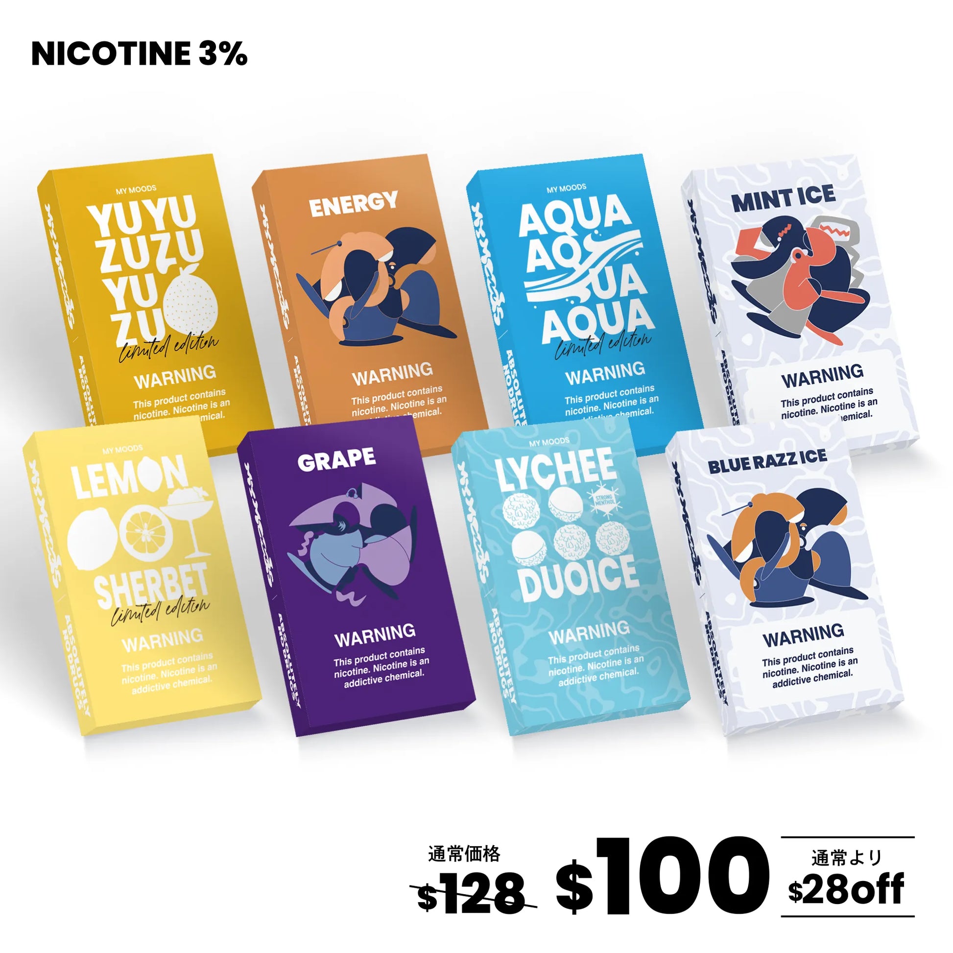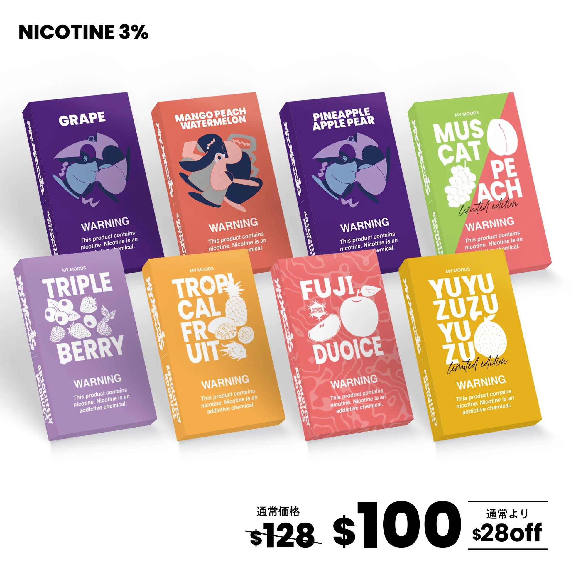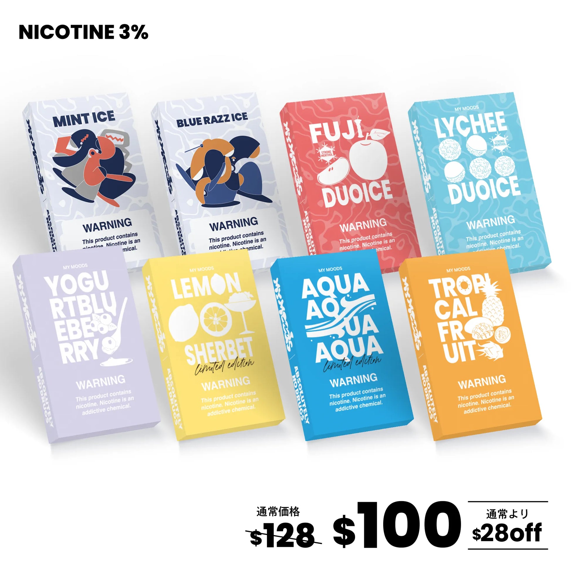MyMoodsが「Moodを変えるVAPE」をコンセプトに大手香料メーカーと約2年の期間を掛けて開発したニコチン3%POD型VAPEのニコチン入りPODが約$128分が入ったお得なセットとなります。