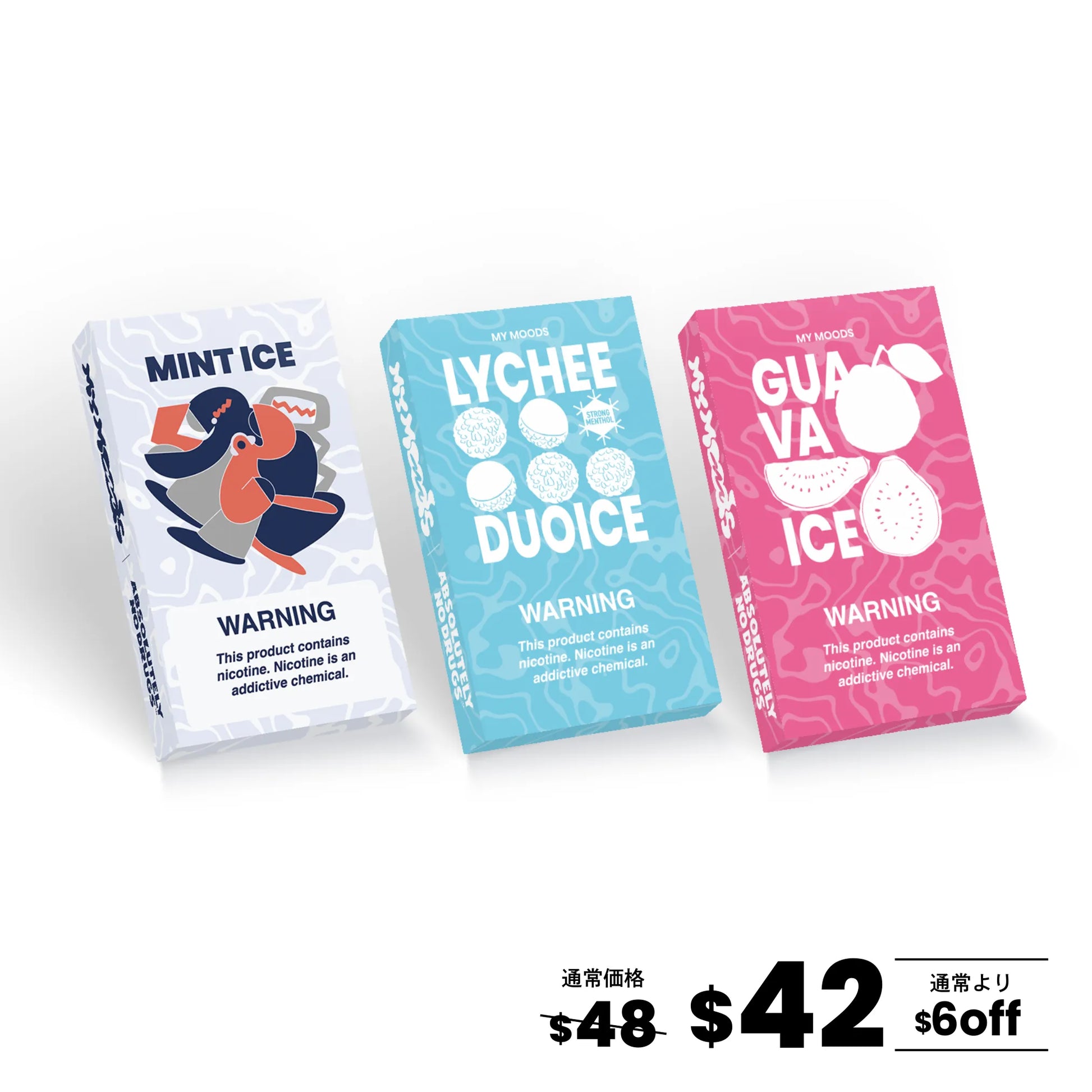 MyMoodsが「Moodを変えるVAPE」をコンセプトに大手香料メーカーと約2年の期間を掛けて開発したニコチン3%POD型VAPE約48$分が入ったお得なセットとなります。