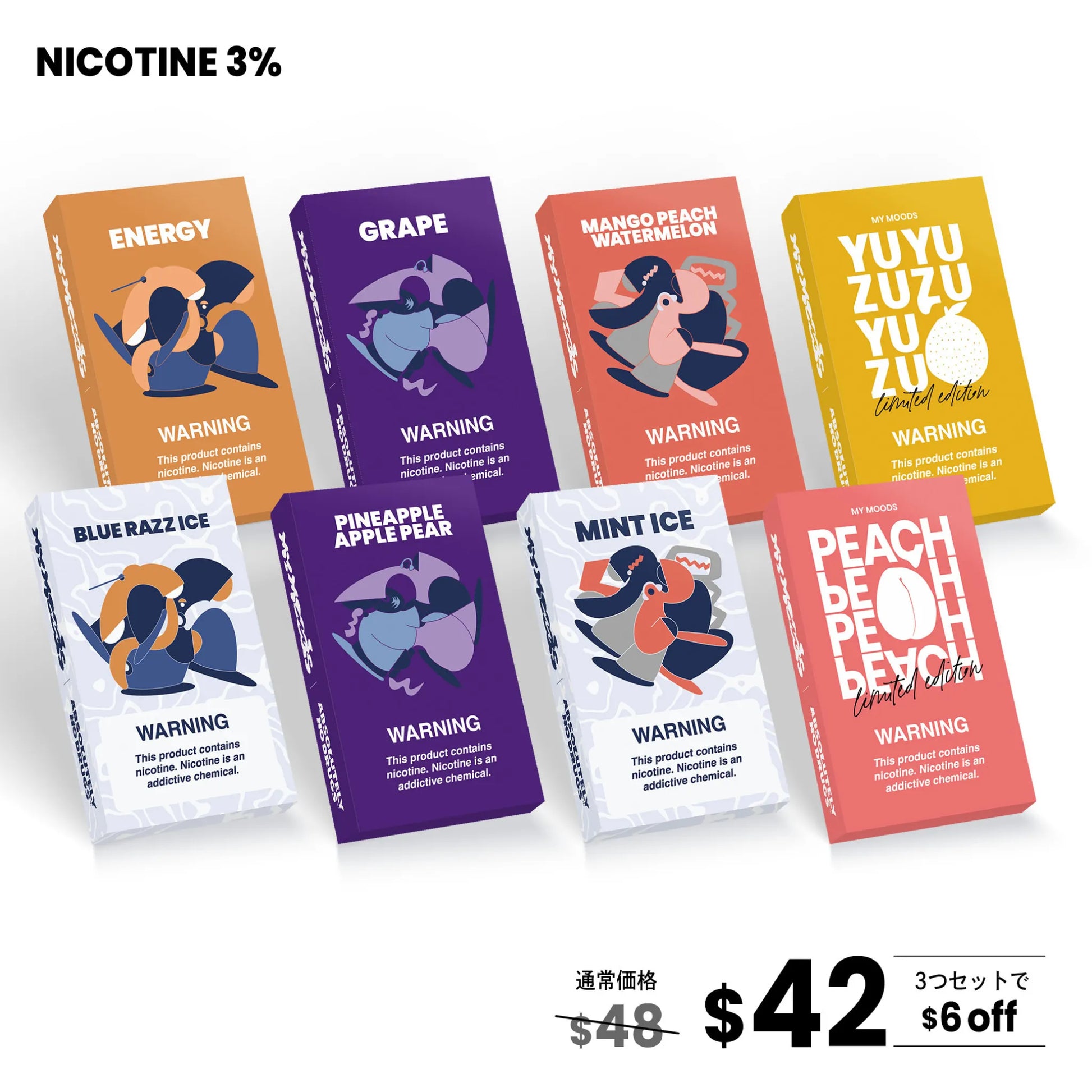 MyMoodsが「Moodを変えるVAPE」をコンセプトに大手香料メーカーと約2年の期間を掛けて開発したニコチン3%POD型VAPE約48$分が入ったお得なセットとなります。