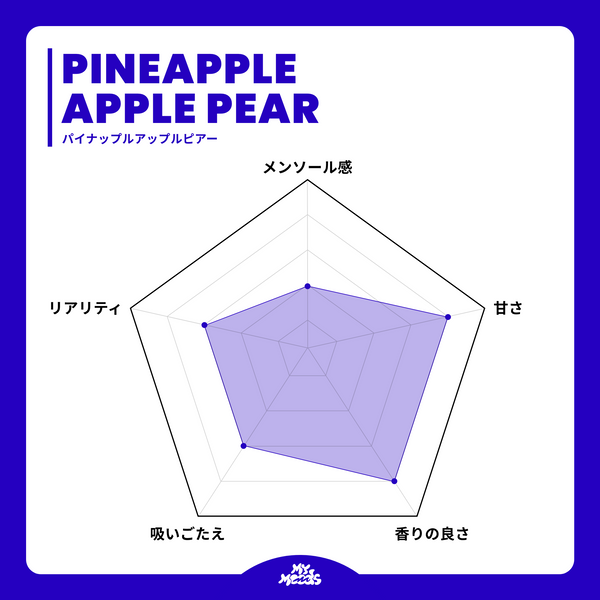 パイナップル、りんご、梨の味わいをミックスした、甘く爽やかなフレーバー。バランスのいい風味は甘すぎることなく、長く吸い続けることができます。吸うシーンを選ばず寄り添ってくれるフレーバーです。