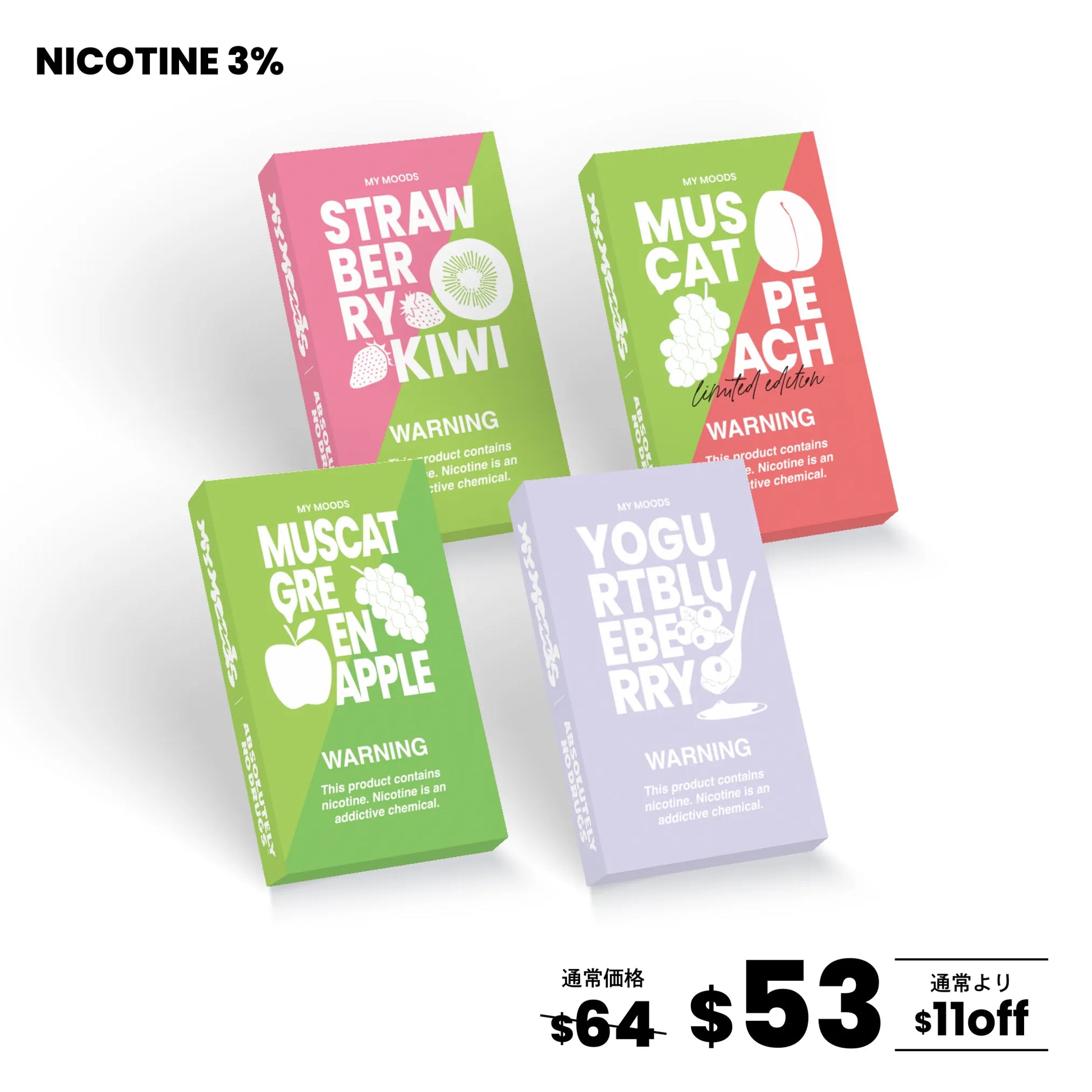 MyMoodsが「Moodを変えるVAPE」をコンセプトに大手香料メーカーと約2年の期間を掛けて開発したニコチン3%POD型VAPEのPODが約$64分が入ったお得なセットとなります。