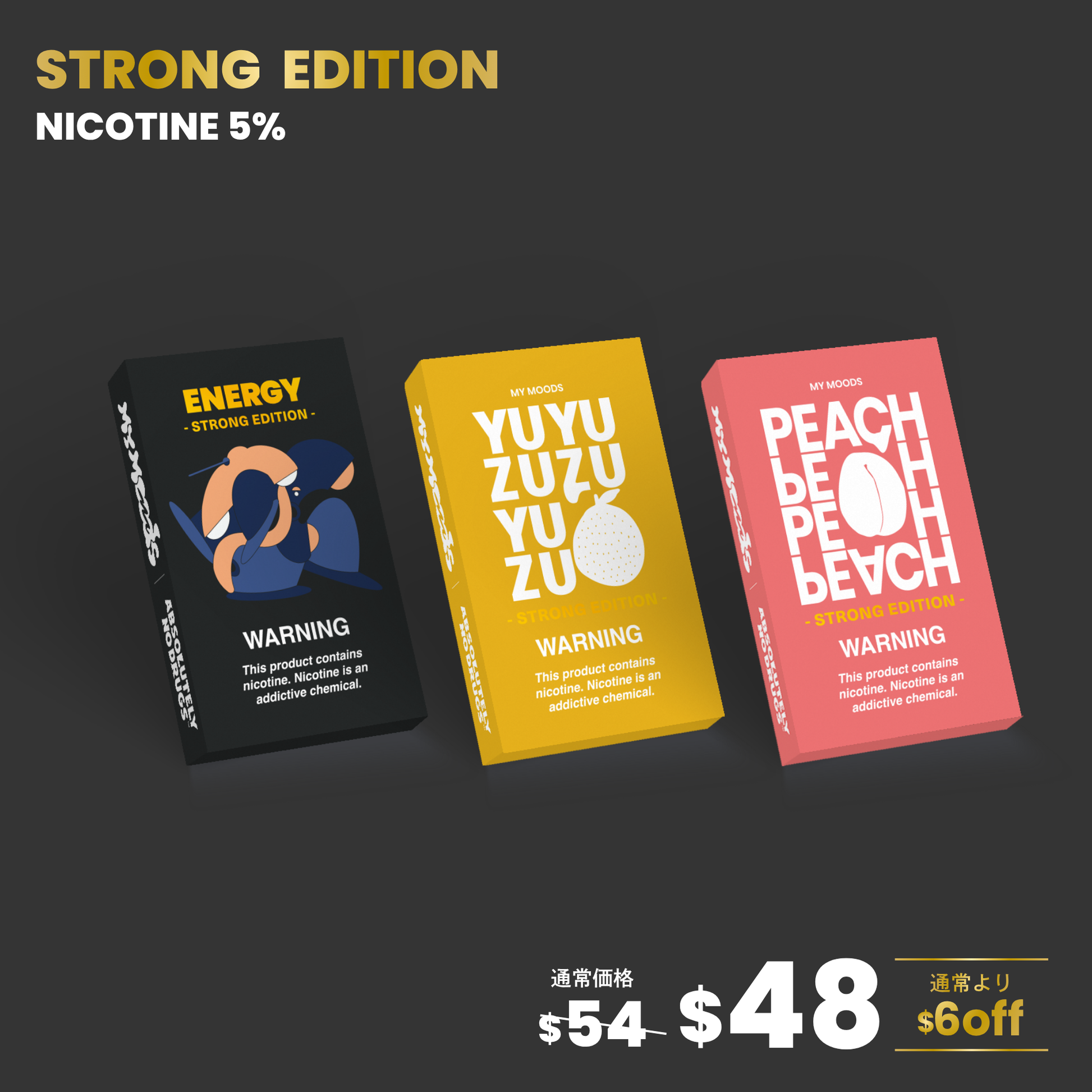 MyMoodsが「Moodを変えるVAPE」をコンセプトに大手香料メーカーと約2年の期間を掛けて開発したニコチン5%POD型VAPE約54$分が入ったお得なセットとなります。